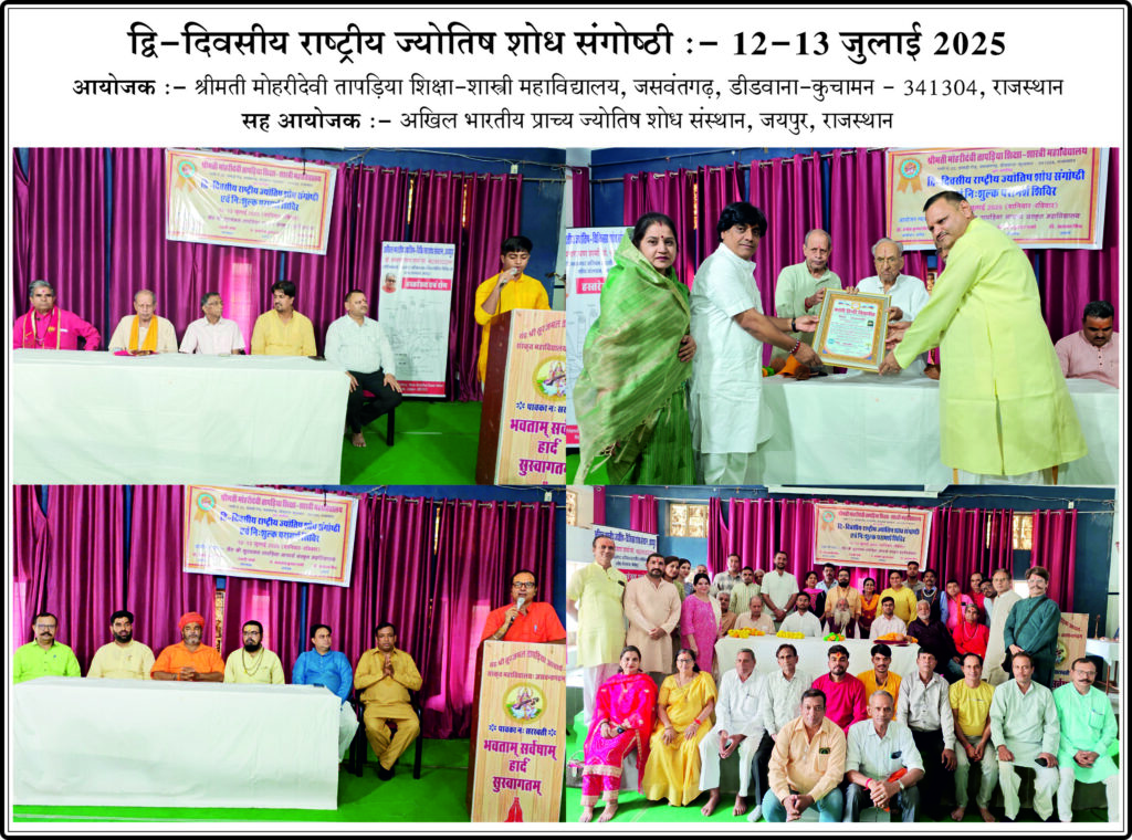 द्वि-दिवसीय राष्ट्रीय ज्योतिष शोध संगोष्ठी :- 12-13 जुलाई 2025 आयोजक :- श्रीमती मोहरीदेवी तापड़िया शिक्षा-शास्त्री महाविद्यालय, जसवंतगढ़, डीडवाना-कुचामन 341304, राजस्थान सह आयोजक :- अखिल भारतीय प्राच्य ज्योतिष शोध संस्थान, जयपुर, राजस्थान